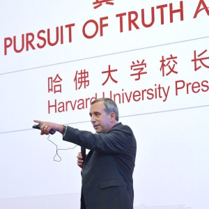 Harvard President Larry Bacow, on a 10-day trip to the Far East, tells audience at Peking University in China of commonalities, and expresses hope for continued collaboration.