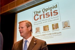 Gov. Charlie Baker joined HMS faculty members in discussing the opioid crisis and the role physician education must play in fighting it.