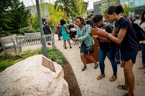 President Drew Faust and University officials unveiled a plaque to honor and remember slaves whose labor helped fund the bequest establishing Harvard Law School 200 years ago.