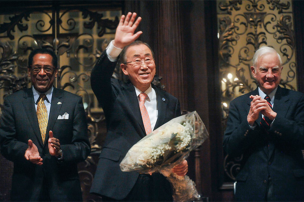 Warning of myriad international problems, United Nations Secretary-General Ban Ki-moon urged Harvard faculty and students to continue research on such issues and use what they learn to help improve living and environmental conditions.