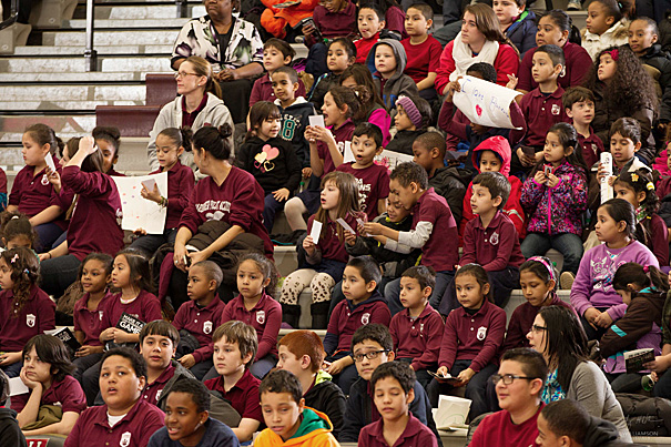 More than 750 students from two Allston schools packed the stands at Lavietes Pavilion to watch the Harvard women’s basketball team in action and learn about student athletes.