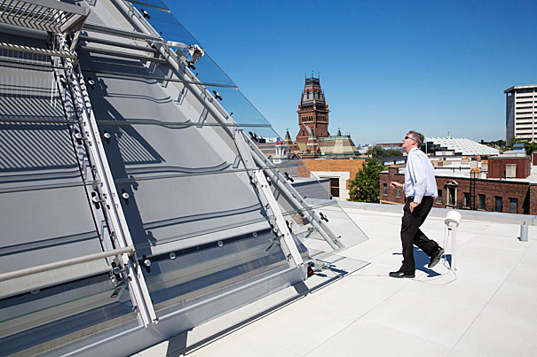 The glass-and-steel roof, the calling card of Pritzker Prize-winning Italian architect Renzo Piano, caps the expanded and renovated Harvard Art Museums and is the building’s defining feature.