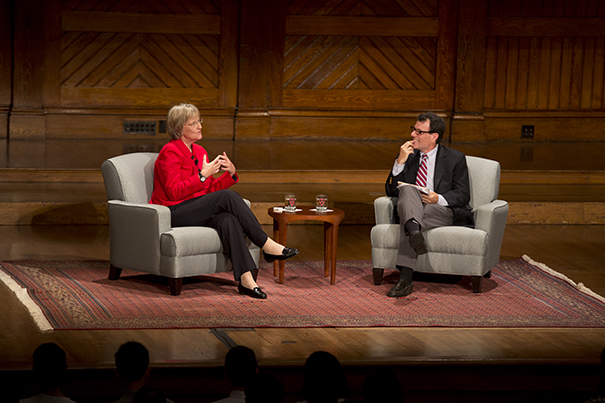 President Drew Faust discussed challenges facing Harvard at the start of a new academic year in a conversation with journalist Nicholas Kristof at Sanders Theatre.