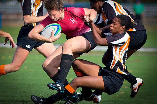 It was pretty much the opposite of a quiet Saturday morning brunch, a rough-and-tumble rugby match in which 15 fierce and brawny Harvard women relentlessly tackled Princeton’s players to move the ball up the pitch and score.