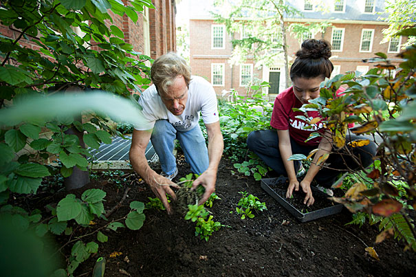 For the second consecutive year, Harvard’s landscaping staff brought trees, shrubs, boxes of bulbs, and a new bench to Harvard Yard. With their help, students, proctors, and administrators transformed the space into a more inviting setting.