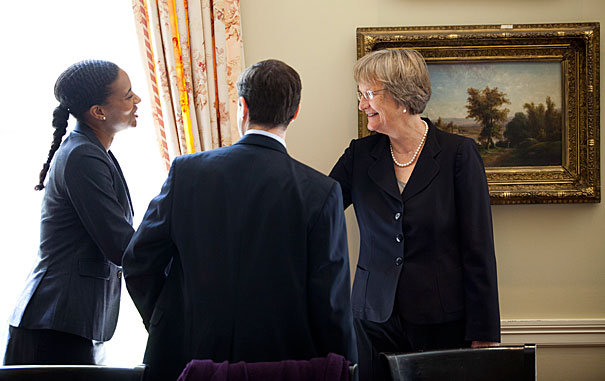 Harvard President Drew Faust met with a new crop of Presidential Public Service Fellows for a candid discussion of what the University can do to promote public service as a career and a calling.