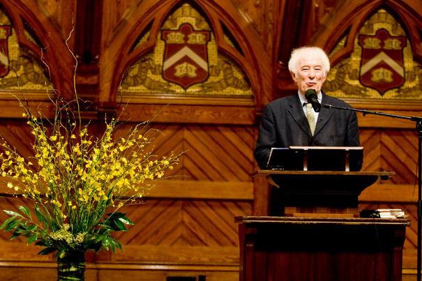 Nobel Laureate and onetime Harvard professor Seamus Heaney will reprise a 1986 poem at Commencement this year, celebrating Harvard in its 375th year – and inspiring a new a cappela work by Richard Beaudoin.
