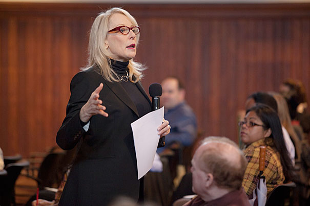 Representatives of Harvard and many agencies gather to celebrate preserving the affordability of 25 homes in Chapman Arms Apartments in Harvard Square.