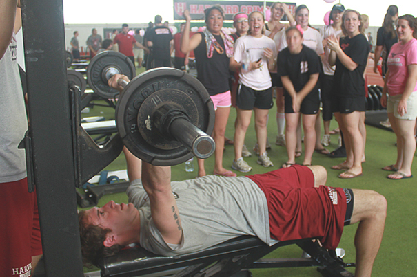 On May 3, more than 250 Harvard athletes from 18 varsity teams took the Palmer-Dixon Gymnasium by storm for the second annual Bench Press for Breast Cancer Challenge, pumping iron and raising greenbacks for the Susan G. Komen for the Cure.
