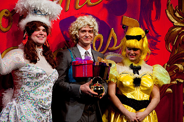 Looking dapper under the bright lights of New College Theatre, Hasty Pudding’s Man of the Year Justin Timberlake took his roast like a man, like only a sexy man can: In pink heels and a platinum blonde wig.