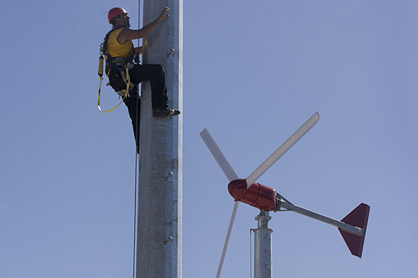 Harvard installs two tall turbines on the top deck of its Soldiers Field Road parking garage, the University’s largest wind power installation to date.