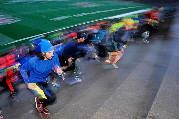 “Good morning!” barks a scarf-wrapped runner in tights, peering through the darkness as she climbs the steps into cavernous Harvard Stadium. A woman nearby responds, “Oh, Hallie, how are you?…
