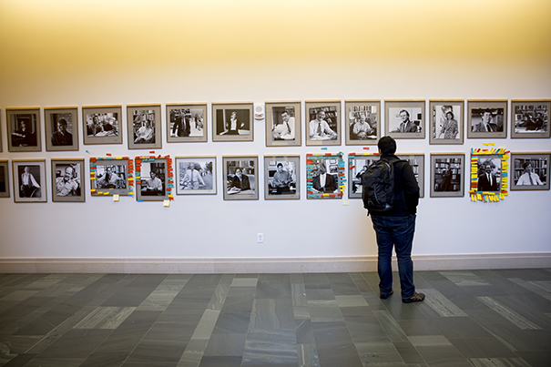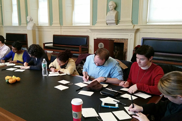 Staff members from the Faculty of Arts and Sciences gathered at University Hall to see friends, enjoy cider and cookies, and write notes to co-workers, in the annual Giving Thanks open house.