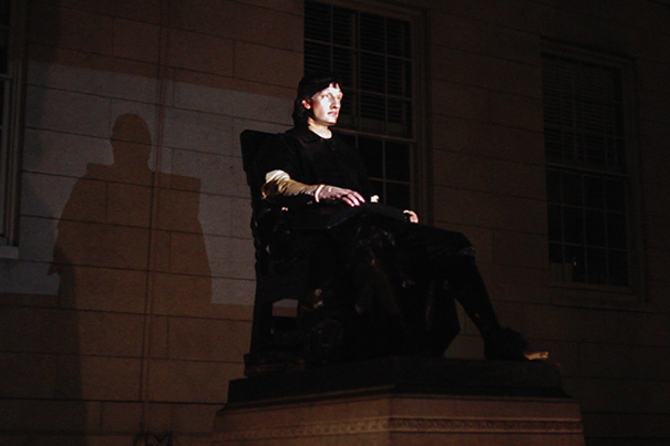 For the next week, Daniel Chester French’s iconic statue will be animated by the faces, voices, and gestures of Harvard students as part of “John Harvard Projection,” a video installation created by artist and Harvard Graduate School of Design Professor Krzysztof Wodiczko.