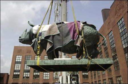 The rhinoceroses that have protected the Biological Laboratories since 1931 are being moved to a warehouse, where they will be stored until completion of a new, underground Biolabs building. A rhino (left) is hoisted by crane onto a waiting truck. The bronze beasts represent the great Indian species, Rhinoceros unicornis, and are equal in size to the largest recorded specimen. The preliminary studies for these bronzes were made at the New York Zoological Park. The sculptor is Katherine Ward Lane Weems.