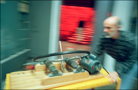 Media services, with its battery of monitors and electronics, shares the prep room with lecture demonstrations, whose shelves burst with Rube Goldberg-style geegaws: beakers and test tubes, a rocket car, magnifying glasses, a few drums, balls of varying sizes on springs, and a stuffed purple dinosaur familiar to toddlers everywhere. “Toys are us,” quips lecture demonstrations manager Wolf Rueckner. Yet his work is hardly child’s play: Demonstrating concepts to physics and chemistry classes demands a firm footing in the subject matter.