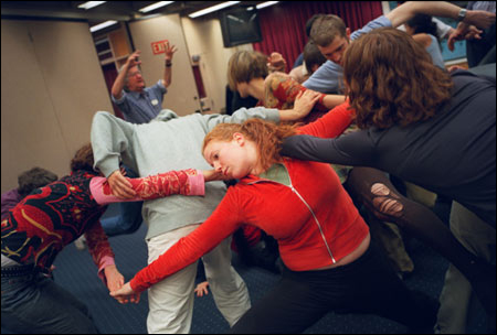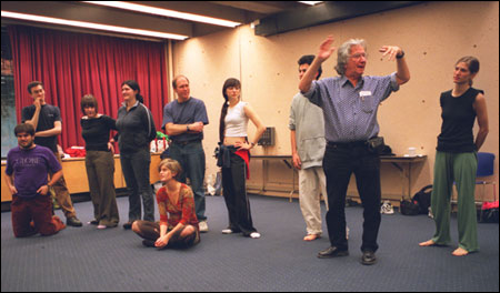 Boal (arms raised) conducts a movement exercise.