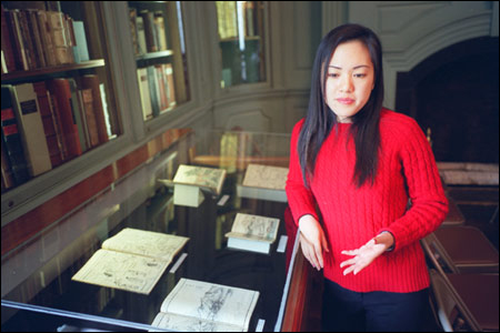 Linda Wanlin Zhang ’06, winner of this year’s Tazuko Ajiro Monane Award, views Japanese books and artwork inside the Houghton Library’s ‘Yenching Library Exhibition,’ which celebrates the 75th year of the Harvard-Yenching Library and highlights its special collections. The Tazuko Ajiro Monane Prize is awarded each year to an outstanding student of Japanese who has completed at least two years of Japanese language study at Harvard. This monetary award is sponsored by the Tazuko Ajiro Monane Memorial Fund, and is hosted by the Japanese Language Program in the Department of East Asian Languages and Civilizations.