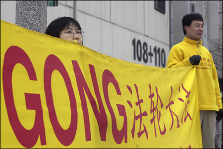 Falun Gong demonstrators adopted a non-confrontational strategy, hoisting a banner that welcomed Wen. Members of the group have been arrested, tortured, and imprisoned in China during a government crackdown over the last few years. Members demonstrating Wednesday attributed the crackdown to both the group’s philosophical beliefs and its popularity.