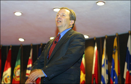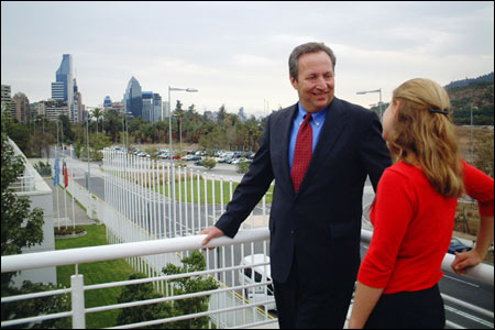 President Lawrence H. Summers reaffirmed Harvard’s commitment to globalization and international education on a trip to Chile and Brazil last week (March 30-April 1), the first formal visit to Latin America by a Harvard president. Public lectures and meetings, including one with Chilean President Ricardo Lagos and one with former Brazilian President Fernando Cardoso, packed Summers’ schedule. But his visits with Harvard undergraduates and faculty members affiliated with the David Rockefeller Center for Latin American Studies’ (DRCLAS) regional office in Santiago, as well as with Brazilian students who are part of a formal exchange program between Harvard and two of Brazil’s most distinguished universities, marked high points to his trip.