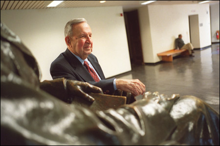 O’Connor, visibly moved, accepted the bronze plaque. The class, nearly filling the large lecture room in Emerson Hall, burst into applause. Since neither O’Connor nor his long-running course on the history of Boston could by any stretch of the imagination be considered purely evil, emotions of uneasiness were running high. But in a few moments it was all over. Shinagel and entourage, led by drum and fife, exited the room, leaving only the vase of flowers behind.