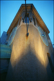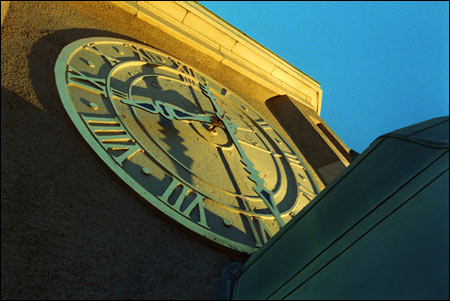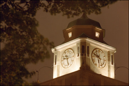 Memorial Hall and Memorial Church have long been luminous nocturnal landmarks of the Cambridge campus. Now, the Adolphus Busch Hall clock tower has joined the dignified beacons of their neighbors. Four years ago, the clock mechanism underwent a major restoration. Now the exterior clock faces have become illuminated. All four clock faces shine with the correct time throughout the night. The light fixtures run on photo cell batteries and go on automatically when it gets dark, turning off just as automatically when daylight creeps back.