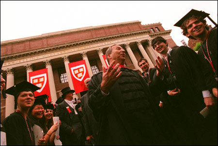 School pride nearly hijacked the message of Stephen E. Frank’s (HLS ’04) Graduate English Address, called “Leaving Footprints in Time.” Harvard Medical School students set the tone with a rowdy cheer as Frank referred to his grandmother’s entry to medical school at age 56. Graduate School of Education students applauded as he told the audience, “We’re graduating to a life of learning,” and students from the Harvard Divinity School let out an un-pious whoop when he recalled his grandmother’s spirit. His Law School classmates applauded several references to recent legal stands against injustice, and the School of Public Health took the spotlight when he mentioned the recent Goodridge v. the Department of Public Health case that legalized same-sex marriage in Massachusetts. Even students from the Graduate School of Design had their moment, cheering loudly as Frank decried “poorly designed immigration policies.”