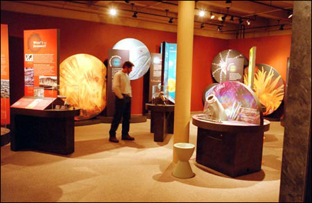 The exhibit follows a chronological track, greeting visitors with a large picture of a glowing river of lava flowing off a cliff into the ocean and setting the stage with a description of the early Earth. The planet was born 4.6 billion years ago, and by 3.8 billion years ago, life had already established a foothold.