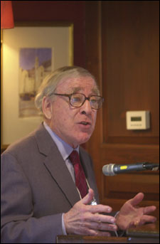 Each year, newly returned Weissman interns are welcomed back at an annual luncheon held at the Harvard Faculty Club. On Monday (Oct. 25), the 2004 interns spoke with Dean of the Faculty of Arts and Sciences William C. Kirby and others about insights gained, perspectives shifted, and worldviews broadened. In most cases, internship experiences not only yielded impressive workplace accomplishments, but also had a significant impact on students’ current and future plans. For many, having such an opportunity spurred a passion for further international experience, be it work, study, purposeful travel, or research abroad.