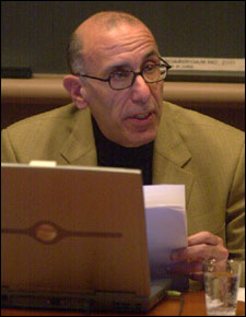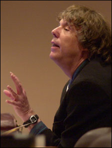 Daniel Albright, a professor of English and American Literature and Language who has written extensively on music, began by alluding to the discomfort he felt having the subject of his talk sitting right in front of him.
