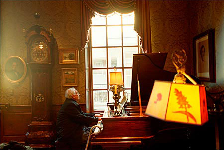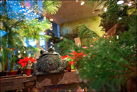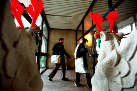 After a holiday shopping spree with her mom, freshman Abby Cushing brings a Norfolk Pine back to her dorm in the Yard. (Staff photo Kris Snibbe/Harvard News Office) Dickens redux: In a scene that looks like it could have come from ‘A Christmas Carol,’ Richard Masters ’49, M.D. ’53, Ph.D. ’64, plays Beethoven’s Moonlight Sonata at the Faculty Club. (Staff photo Stephanie Mitchell/Harvard News Office) A well-fed frog oversees the window display at the Holyoke Center flower shop Petali. (Staff photo Stephanie Mitchell/Harvard News Office) But where’s the mistletoe?: Maria Stavropoulos ’05 reads under some diverse holiday decorations at Gato Rojo Cafe in Dudley Hall. (Staff photo Stephanie Mitchell/Harvard News Office) No two snowflakes are exactly alike and no two pieces of Harvard apparel are entirely different. (Staff photo Jon Chase/Harvard News Office) The frightening guards at the entry to the GSD (right) are a bit less intimidating when they don their yuletide antlers. (Staff photo Rose Lincoln/Harvard News Office)
