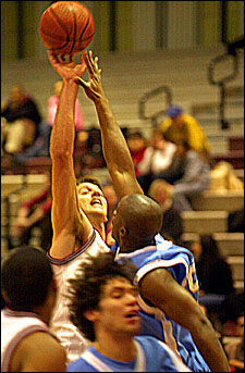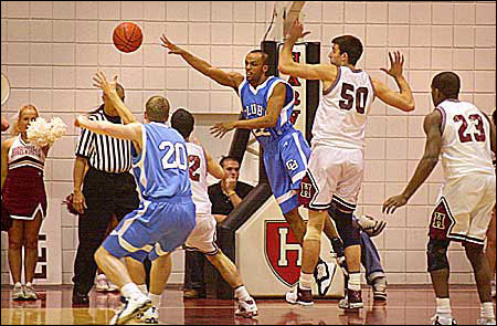 Rogus led the Harvard charge against the Big Red, collecting 23 points, 18 of them from behind the arc, where he went 6 for 12. Teammates Brian Cusworth ’07 at center and forward Matt Stehle ’06 each pitched in 10 points in the losing effort. Stehle also grabbed 11 rebounds to collect his second straight double-double, his eighth on the season.