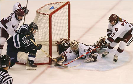 Despite falling to Cornell, 3-1, in the ECAC championship game on March 19, the men’s team received an at-large bid to the 2005 NCAA tournament. The No. 3 Crimson (21-9-3) will face the No. 2 University of New Hampshire (25-10-5) in the Northeast Regional semifinal on Saturday (March 26) at 3:30 p.m. at the University of Massachusetts, Amherst. Defending national champion Denver will battle Bemidji State University at noon. Visit http://www.gocrimson.com for men’s and women’s scores and updates.