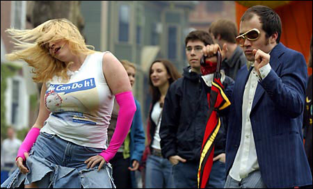 While some students were taking a wild ride on the Whirly Bird and others were facing off in gladiatorial bouts, and still others rocked and bopped to the sound of Blanks, they all shared one thing: They were wet. At first, just intermittently wet, then as annual Springfest partied on, pretty darn wet, then in the middle of a set by the punk band Plan B for Type A’s, pretty much soaked as the heavens opened up and blessed the festivities with a deluge. Another thing all the good-sport attendees had in common: a great time. Really. – Alec SolomitaSabrina de Abreu ’06 and Mathieu Desruisseaux ’07 (right) take a spin on the Whirly Bird as the rain begins to fall.Mary Emily Colvin ’05 (center) and Jonathon Bardin ’06, representatives of Currier House, heft the Green Cup, an award presented to the most environmentally friendly dorm, as sweatshirted Tasha Bartch ’05 looks on.