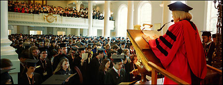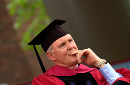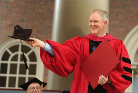 Lithgow blended his skills as an actor, a writer of children’s books, and a supporter of Harvard to recite “Mahalia Mouse Goes to College,” a yet-unpublished rhyming children’s story dedicated to the Class of 2005. Charting the adventures of a precocious young mouse who finds success and inspiration after stumbling into a college science class, Mahalia’s tale was created in part to excite children about education, said Lithgow. Mahalia, who excels at her studies and pursues a wide range of collegiate extracurricular activities, from fencing to square dancing, “succeeded by simply refusing to fail,” he recited.