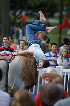 Corn dogs, cotton candy, a mechanical bull, scattered bales of hay, and a dunking booth transformed usually staid Tercentenary Theatre into the first Harvard State Fair on a shady Sept. 23rd evening.Gene Corbin (right, in blue shirt), director of the Phillips Brooks House Association, reaches ruthlessly for another ball after dunking Matt Glazer ’06. (Staff photo T.J. Kirkpatrick/Harvard News Office)As Harvard affiliates lined up on one side of the green for sloppy joes and sausages, determined students stood at a longer line on the other side to get a chance to dunk their favorite House master or dean. To the tunes of classic country music, meanwhile, a mechanical bull unseated rider after rider in front of the steps of Widener Library.At Movie Night at Harvard, Anna Kendrick ’09 (left) and Eva Young ’09 stake out their spot early in the Yard for the double feature. (Staff photo Justin Ide/Harvard News Office)Another transformation of the Yard took place only days later when Movie Time at Harvard featured an adventuresome Sunday evening (Sept. 25) double feature, sponsored by President Summers. “Pirates of the Caribbean” and “Batman Begins” flickered through the night as students, faculty, and staff sat on blankets eating popcorn, drinking soda, or simply getting lost in other worlds.