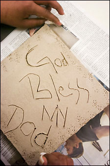 Class begins. Amid escalating chatter, Nia is entranced, silently rolling out clay tubes with her fingers, then coiling and smoothing the sides of her emerging pot. Other girls are digging words and phrases like “God bless my dad,” “happiness,” or “love” into the clay slabs and adding flowers and hearts. Teacher Kati Blair, a graduate student with the Harvard Graduate School of Education’s (HGSE) Arts in Education program, and Erin Mishkin, HGSE student and volunteer, circulate among the girls. They suggest ideas for projects, demonstrate sculptural strategies, and offer various tactics to solve the problem at hand. Arts Incentives Program mentors provide feedback and encouragement.