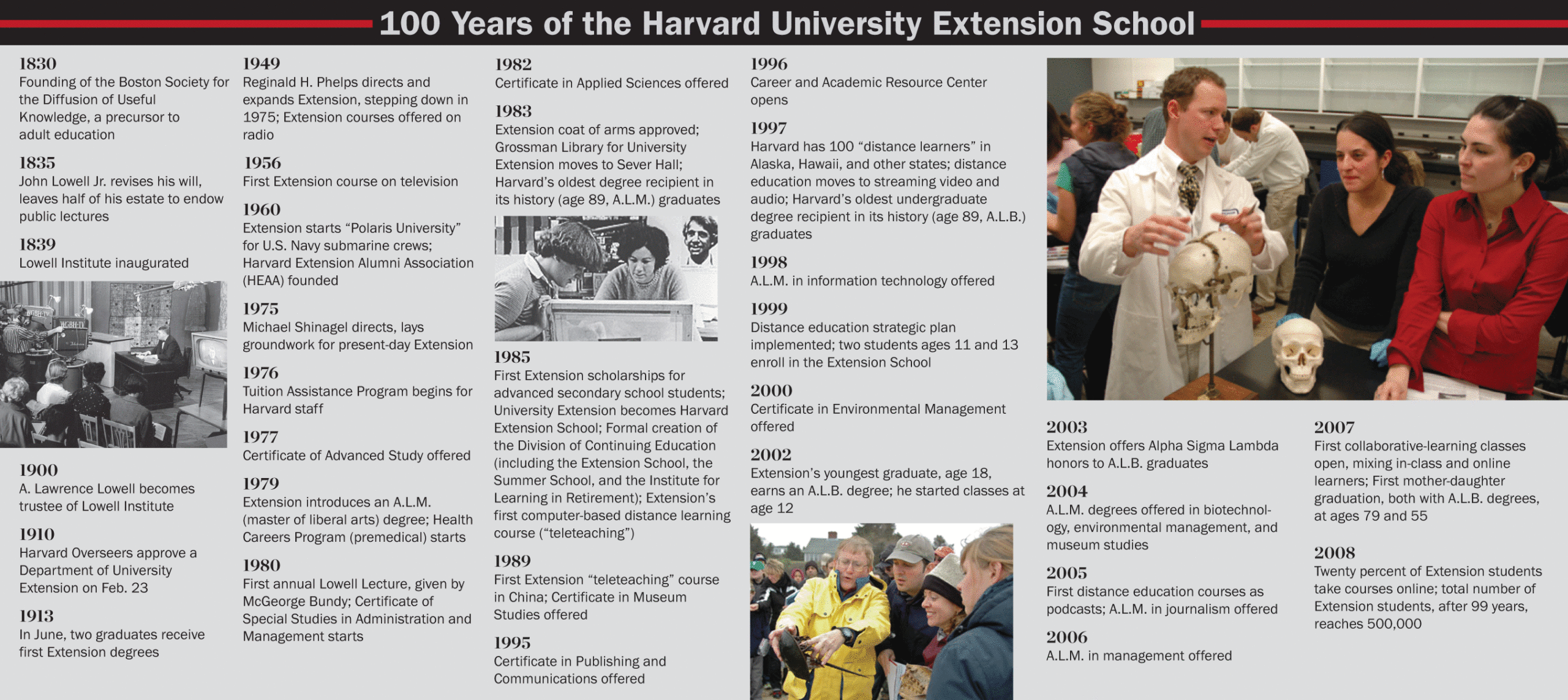 “Much has changed in the 10 decades” since Extension’s founding, Harvard President Drew Faust said last month, yet “Extension remains rooted in its original principles. We still honor [President] Lowell’s vision of Harvard’s own responsibility to extend the University’s intellectual benefits beyond the confines of its walls and to recognize its interconnectedness with its surrounding community, and with the world.”
