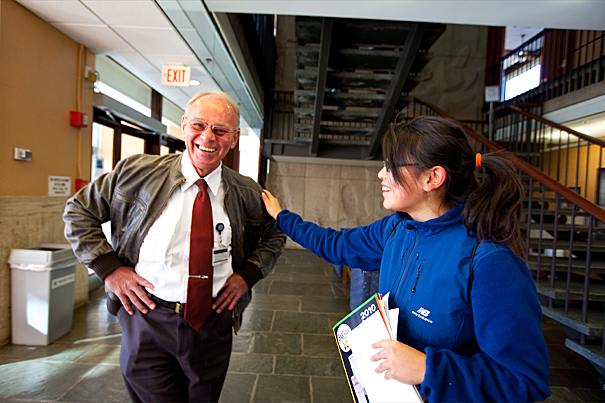 Students can’t get through the door without Quincy House security guard Paul Barksdale getting to know them. Since he started in 2003, he has made a point of memorizing the name, face, and concentration of every incoming sophomore. Senior Janet He (right) sings his praises.