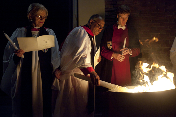 Dorothy Austin (from left), Sedgwick Associate Minister in the Memorial Church; Peter J. Gomes, Plummer Professor of Christian Morals and Pusey Minister in the Memorial Church; and Martin Wallner ’11, verger, light candles from a bonfire during “The Great Vigil of Easter” at the Memorial Church.