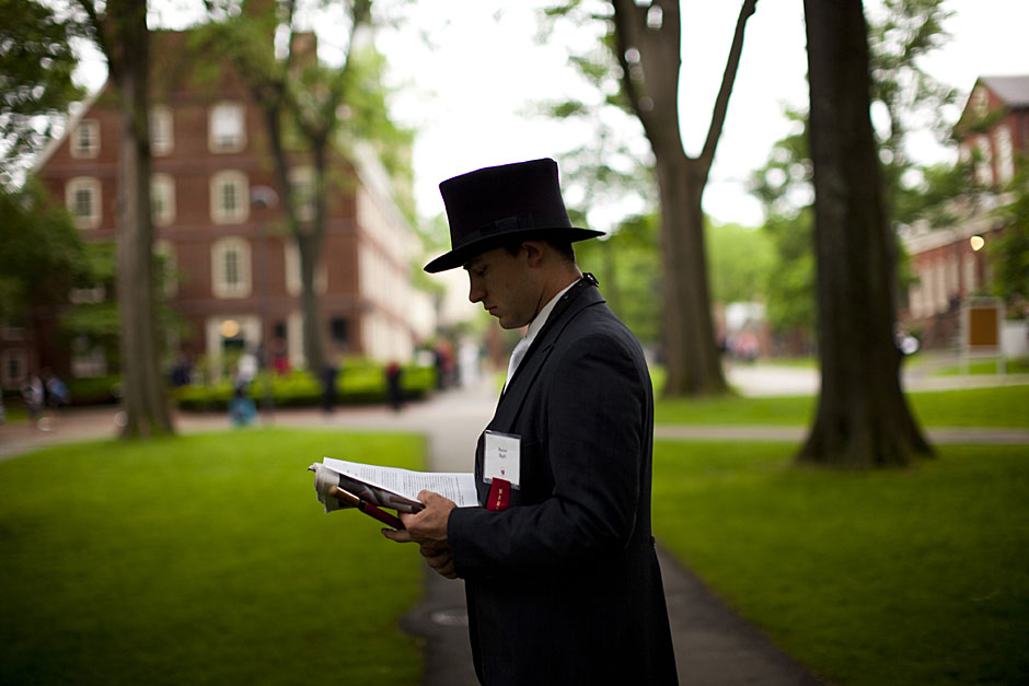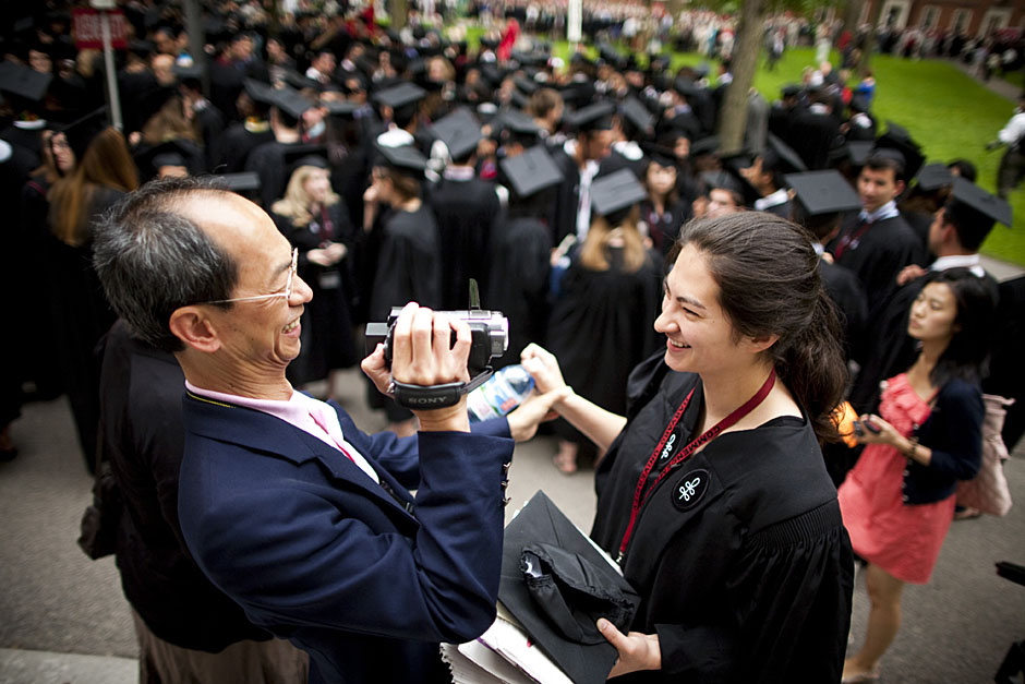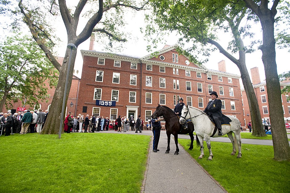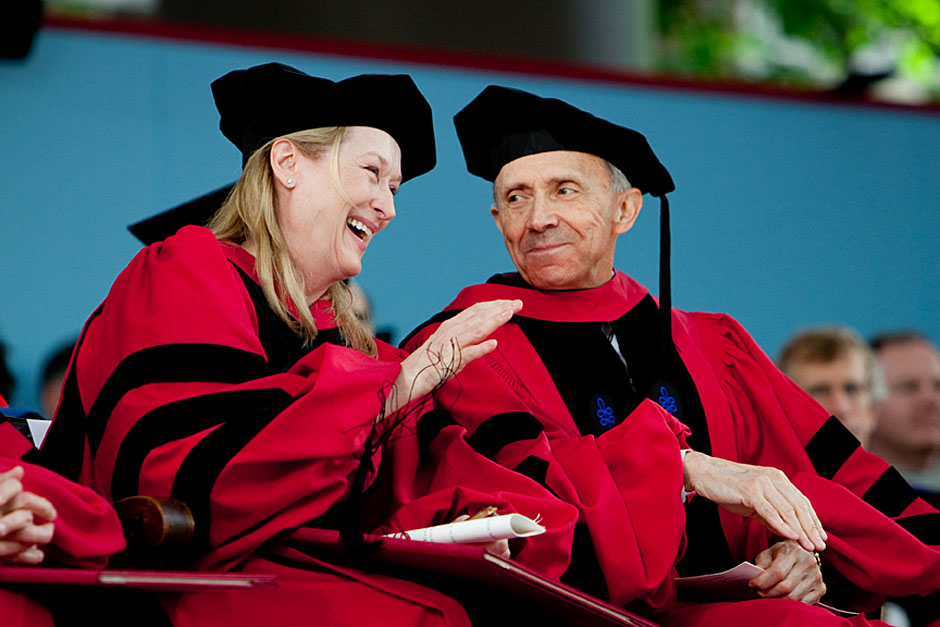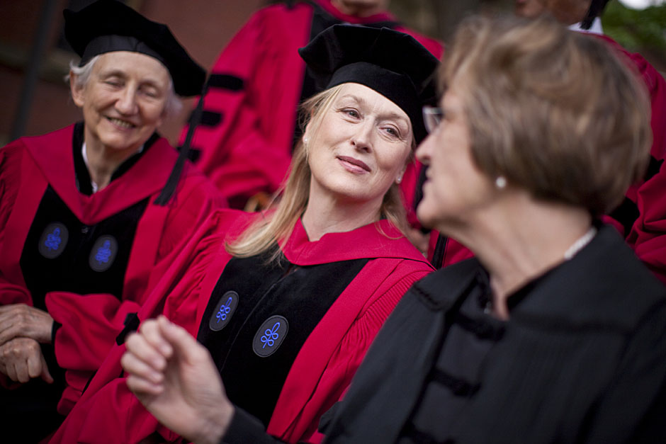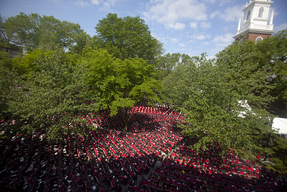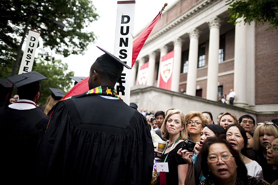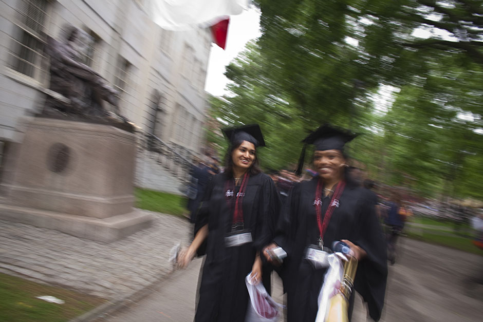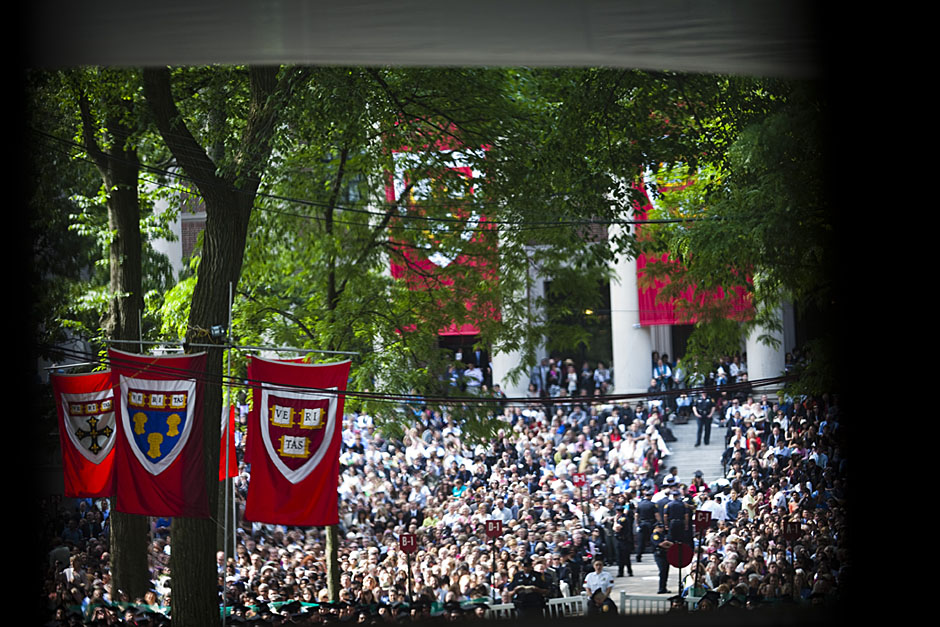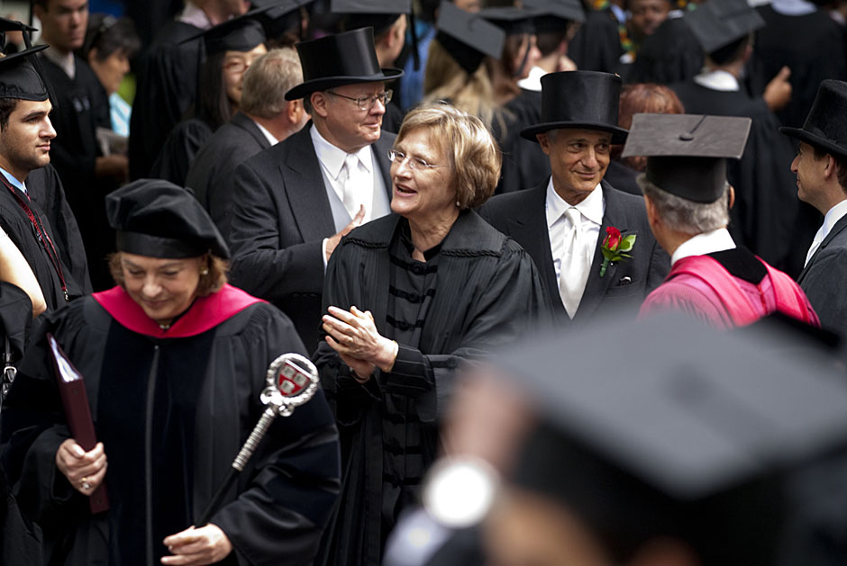 Winthrop House graduates Jonathan Steinman (from left), Laura Peterzan, and Laurel Macey march up Dunster Street toward Commencement Exercises. Rose Lincoln /Harvard Staff Photographer Class of 1969 members Jonathan Hubbard of Chicago (left) and Hugh Kelley of Wellesley size up their regalia prior to the morning festivities. Justin Ide/Harvard Staff Photographer Marshal Aaron Byrd reads in the yard before the exercises begin. Stephanie Mitchell/Harvard Staff Photographer Yinka Adio (from left) and Abimbola Odutayo help Kayode Odutayo of the Harvard School of Public Health straighten his cap and gown. Kris Snibbe/Harvard Staff Photographer Retired U.S. Supreme Court Justice David Souter, an honorary degree recipient and the speaker for the Afternoon Exercises, talks with President Drew Faust inside Massachusetts Hall prior to the festivities. Justin Ide/Harvard Staff Photographer Christoph Luschin and his father, Hanno, from the Ukraine, walk past a mural on Brattle Street of Charlie Chaplin doffing his hat. Luschin graduated from the Law School. Jon Chase/Harvard Staff Photographer Sheriff of Middlesex County James DiPaola rides a white horse into Harvard Yard. He is responsible for officially declaring the start of Commencement, decreeing, “This meeting will be in order.” Kristyn Ulanday/Harvard Staff Photographer Harvard College Dean Evelynn Hammonds waves to graduates from the steps of University Hall as they gather for the senior service inside the Memorial Church. Justin Ide/Harvard Staff Photographer Graduates from the College pass the John Harvard Statue and University Hall on their way to the senior service. Justin Ide/Harvard Staff Photographer Suveg Pandey (left) and Whitney Williams fit in a quick nap before the service begins in Memorial Church. Stephanie Mitchell/Harvard Staff Photographer Graduates exit the Memorial Church following the morning service for seniors. Stephanie Mitchell/Harvard Staff Photographer Honorary degree recipients Baroness Onora O’Neill of Bengarve (from left) and Meryl Streep listen to Harvard President Drew Faust just prior to the procession. Justin Ide/Harvard Staff Photographer Tony Lam and his daughter, Eva Lam ’10, share a moment on the steps of University Hall. Stephanie Mitchell/Harvard Staff Photographer Family members watch the graduates process in front of the steps of Widener Library. Stephanie Mitchell/Harvard Staff Photographer Harvard President Drew Faust walks through lines of graduating students in Harvard Yard. Kristyn Ulanday/Harvard Staff Photographer Graduates process into Tercentenary Theatre. Stephanie Mitchell/Harvard Staff Photographer Graduates enjoy a picture-perfect blue sky as Morning Exercises commence. Kris Snibbe/Harvard Staff Photographer Proud parent Caroline Kennedy celebrates her daughter’s graduation. Justin Ide/Harvard Staff Photographer Graduates and their families fill Tercentenary Theatre. Stephanie Mitchell/Harvard Staff Photographer Harvard Business School graduates wear hundred dollar bills pinned to their caps in celebration of Commencement. Kris Snibbe/Harvard Staff Photographer Mohammad Chishti (left) and Katherine Chon celebrate the conferral of their degrees with Harvard Kennedy School classmates. Jon Chase/Harvard Staff Photographer Members of the Harvard School of Public Health Class of 2010 celebrate. Kris Snibbe/Harvard Staff Photographer Honorary degree recipients Meryl Streep and David H. Souter share a laugh. Rose Lincoln/Harvard Staff Photographer Graduate School of Design students decorate their caps with lego designs representing green buildings. Kristyn Ulanday/Harvard Staff Photographer Jason Aaron Katz (from left), Rebecca Hart, and Ricky Hart watch the Morning Exercises. Stephanie Mitchell/Harvard Staff Photographer Harvard awarded a total of 7,125 degrees and 89 certificates at its 359th Commencement. Kris Snibbe/Harvard Staff Photographer Harvard Business School graduate Tong Chen celebrates by waving a dollar bill and the Chinese flag. Jon Chase/Harvard Staff Photographer Comedian Jimmy Tingle, who delivered the Graduate English Address, bumps fists with University Marshal Jackie O’Neill. Jon Chase/Harvard Staff Photographer Actress Meryl Streep blows a kiss to the audience after receiving her honorary degree. Jon Chase/Harvard Staff Photographer Jihye Seo, Ph.D. ’10, took seven years to complete her degree. Rose Lincoln/Harvard Staff Photographer Stephen Lwendo ’10 receives his diploma from Quincy House co-masters Lee and Deborah Gehrke. Kris Snibbe/Harvard Staff Photographer Quincy House co-master Lee Gehrke (right) awards diplomas to undergraduates. Kris Snibbe/Harvard Staff Photographer Quincy House resident David Rice ’10 (left) is congratulated by Zachary Stone, research assistant in the School of Engineering and Applied Sciences. Kris Snibbe/Harvard Staff Photographer Shelly Mason (left) and her son, Russell Mason, the first Mason to graduate from college, both shed a tear after he receives his diploma at Winthrop House. Stephanie Mitchell/Harvard Staff Photographer Family members line up to photograph the graduates receiving their degrees. Stephanie Mitchell/Harvard Staff Photographer Anne Austin ’10 greets her friend and fellow Hasty Pudding crew member, Quinn Carson, who unexpectedly showed up to see her graduate. Rose Lincoln/Harvard Staff Photographer Viktor Pokorny ’50, sitting outside Straus Hall, returned to Harvard to celebrate his 60th reunion. Rose Lincoln/Harvard Staff Photographer Richard Griffin ’51 gives the photographer a taste of his own medicine. Jon Chase/Harvard Staff Photographer Graham Taylor ’49 (left) greets his fellow “jock club” friend, Bill Markus ’60 during the Alumni Parade. Rose Lincoln/Harvard Staff Photographer Wallace Sisson of Milton, Mass., consults his phone while volunteering as a member of the Committee for the Happy Observation of Commencement. Kristyn Ulanday/Harvard Staff Photographer