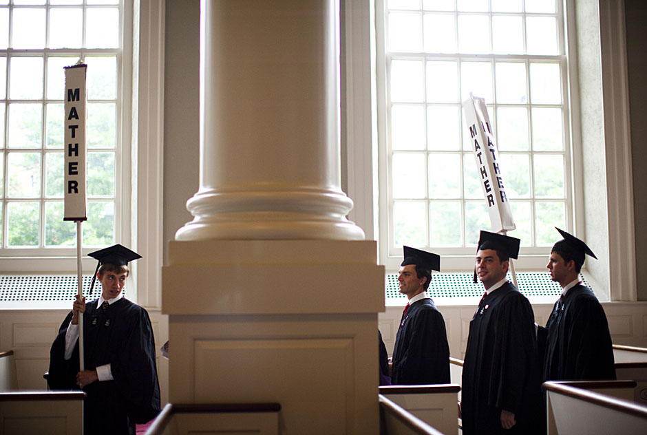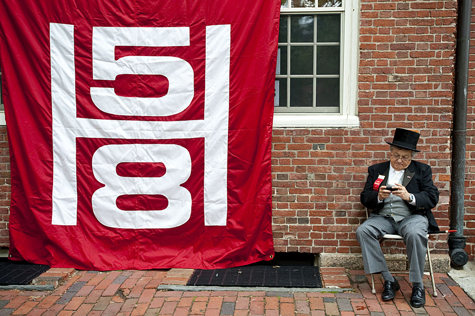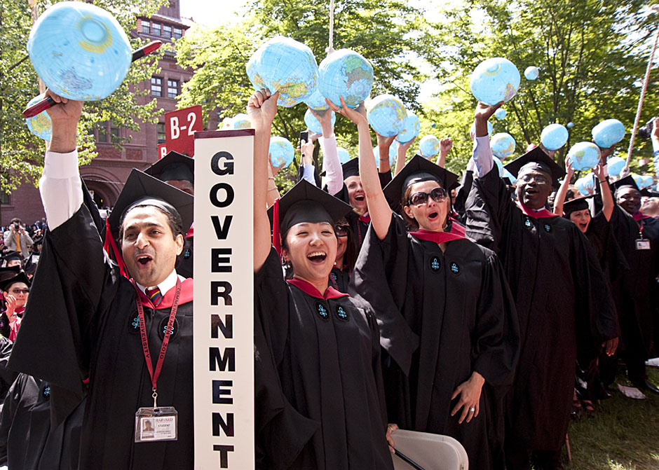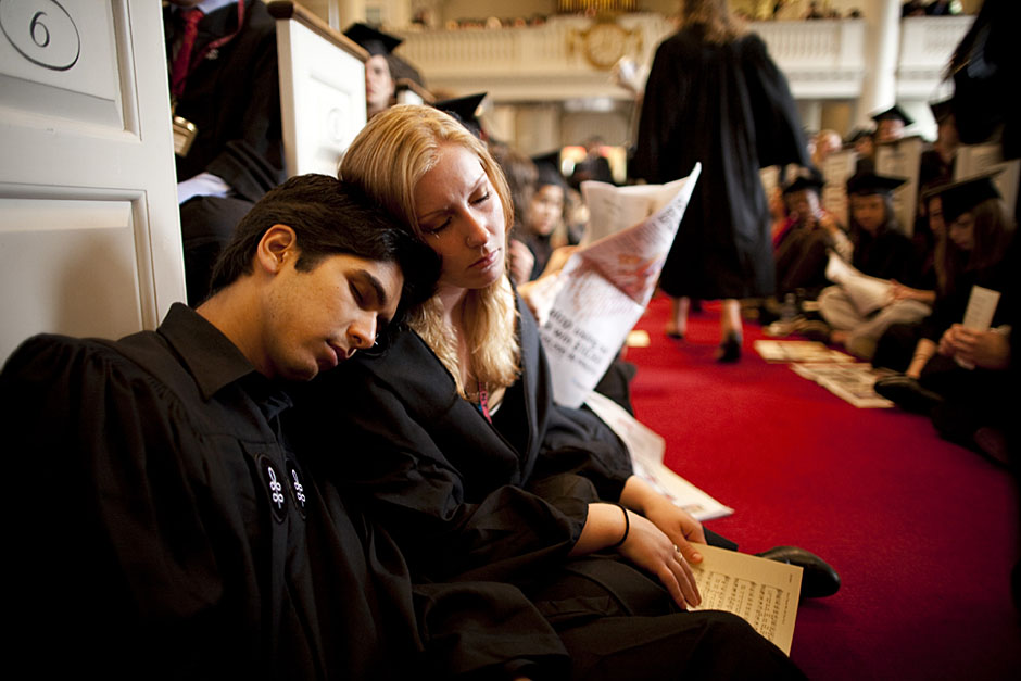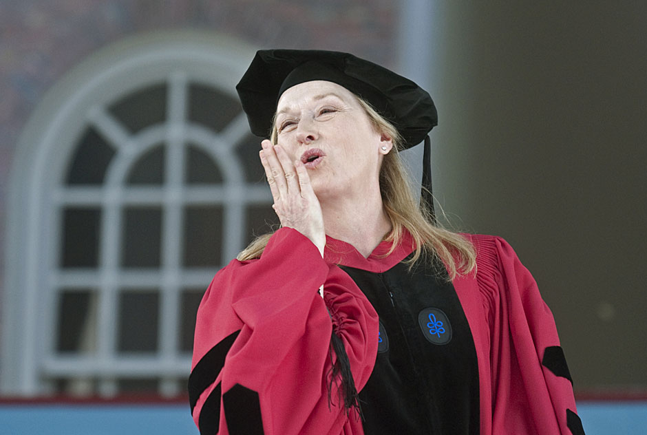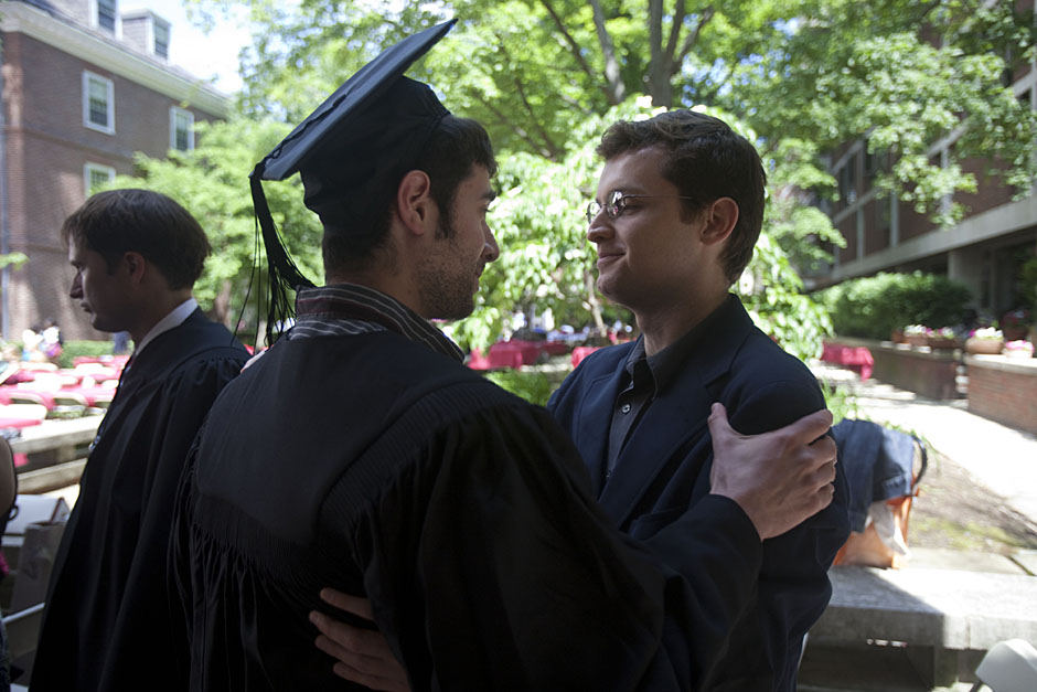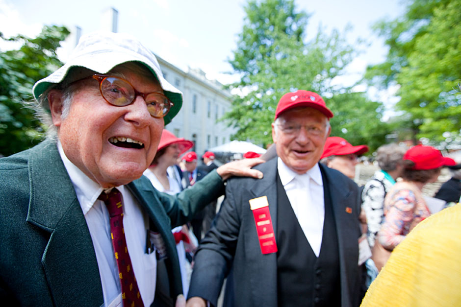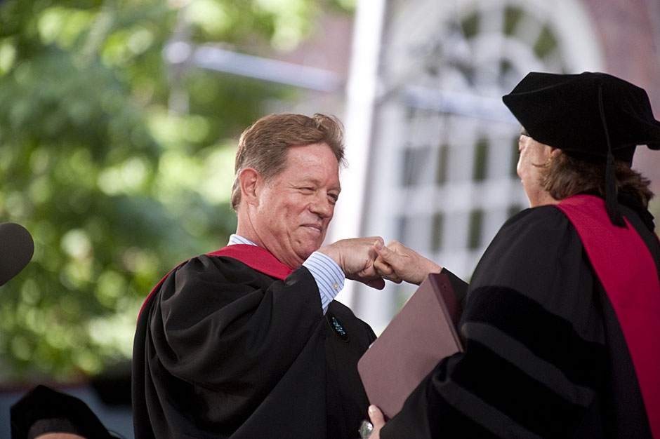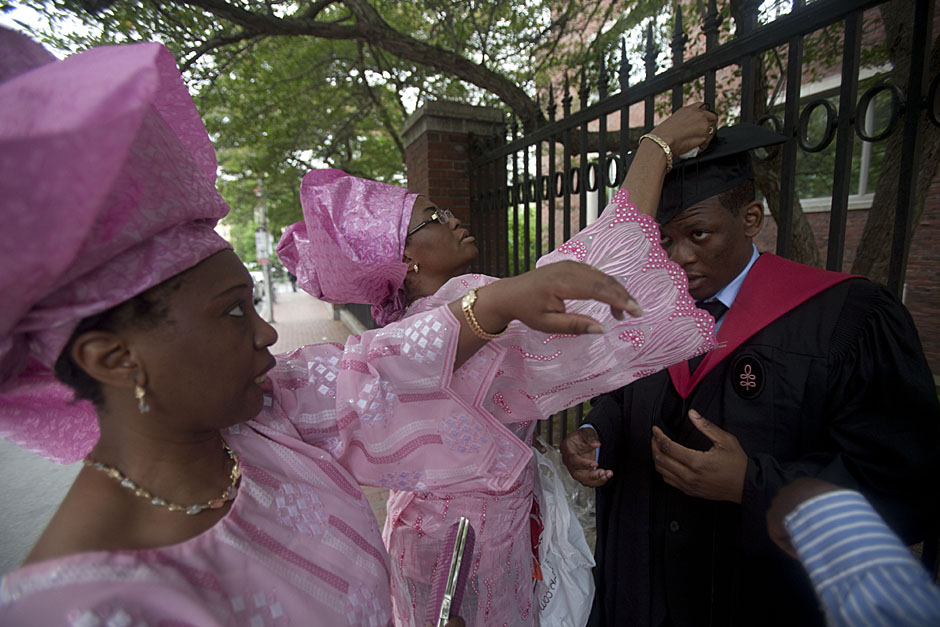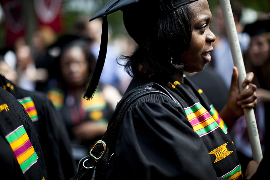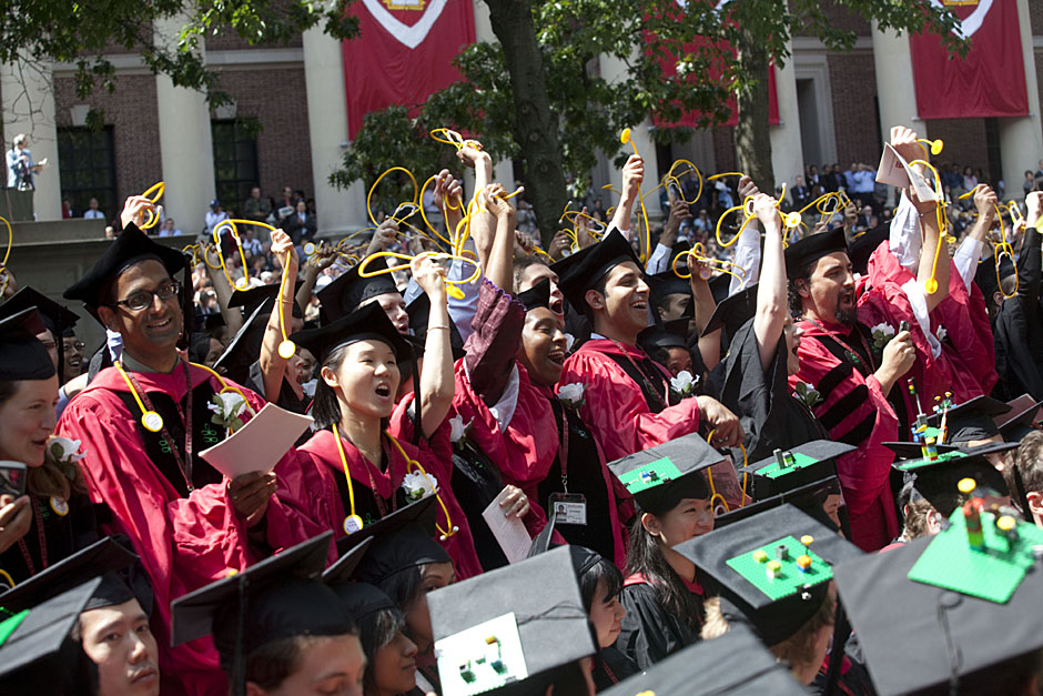 Winthrop House graduates Jonathan Steinman (from left), Laura Peterzan, and Laurel Macey march up Dunster Street toward Commencement Exercises. Rose Lincoln /Harvard Staff Photographer Class of 1969 members Jonathan Hubbard of Chicago (left) and Hugh Kelley of Wellesley size up their regalia prior to the morning festivities. Justin Ide/Harvard Staff Photographer Marshal Aaron Byrd reads in the yard before the exercises begin. Stephanie Mitchell/Harvard Staff Photographer Yinka Adio (from left) and Abimbola Odutayo help Kayode Odutayo of the Harvard School of Public Health straighten his cap and gown. Kris Snibbe/Harvard Staff Photographer Retired U.S. Supreme Court Justice David Souter, an honorary degree recipient and the speaker for the Afternoon Exercises, talks with President Drew Faust inside Massachusetts Hall prior to the festivities. Justin Ide/Harvard Staff Photographer Christoph Luschin and his father, Hanno, from the Ukraine, walk past a mural on Brattle Street of Charlie Chaplin doffing his hat. Luschin graduated from the Law School. Jon Chase/Harvard Staff Photographer Sheriff of Middlesex County James DiPaola rides a white horse into Harvard Yard. He is responsible for officially declaring the start of Commencement, decreeing, “This meeting will be in order.” Kristyn Ulanday/Harvard Staff Photographer Harvard College Dean Evelynn Hammonds waves to graduates from the steps of University Hall as they gather for the senior service inside the Memorial Church. Justin Ide/Harvard Staff Photographer Graduates from the College pass the John Harvard Statue and University Hall on their way to the senior service. Justin Ide/Harvard Staff Photographer Suveg Pandey (left) and Whitney Williams fit in a quick nap before the service begins in Memorial Church. Stephanie Mitchell/Harvard Staff Photographer Graduates exit the Memorial Church following the morning service for seniors. Stephanie Mitchell/Harvard Staff Photographer Honorary degree recipients Baroness Onora O’Neill of Bengarve (from left) and Meryl Streep listen to Harvard President Drew Faust just prior to the procession. Justin Ide/Harvard Staff Photographer Tony Lam and his daughter, Eva Lam ’10, share a moment on the steps of University Hall. Stephanie Mitchell/Harvard Staff Photographer Family members watch the graduates process in front of the steps of Widener Library. Stephanie Mitchell/Harvard Staff Photographer Harvard President Drew Faust walks through lines of graduating students in Harvard Yard. Kristyn Ulanday/Harvard Staff Photographer Graduates process into Tercentenary Theatre. Stephanie Mitchell/Harvard Staff Photographer Graduates enjoy a picture-perfect blue sky as Morning Exercises commence. Kris Snibbe/Harvard Staff Photographer Proud parent Caroline Kennedy celebrates her daughter’s graduation. Justin Ide/Harvard Staff Photographer Graduates and their families fill Tercentenary Theatre. Stephanie Mitchell/Harvard Staff Photographer Harvard Business School graduates wear hundred dollar bills pinned to their caps in celebration of Commencement. Kris Snibbe/Harvard Staff Photographer Mohammad Chishti (left) and Katherine Chon celebrate the conferral of their degrees with Harvard Kennedy School classmates. Jon Chase/Harvard Staff Photographer Members of the Harvard School of Public Health Class of 2010 celebrate. Kris Snibbe/Harvard Staff Photographer Honorary degree recipients Meryl Streep and David H. Souter share a laugh. Rose Lincoln/Harvard Staff Photographer Graduate School of Design students decorate their caps with lego designs representing green buildings. Kristyn Ulanday/Harvard Staff Photographer Jason Aaron Katz (from left), Rebecca Hart, and Ricky Hart watch the Morning Exercises. Stephanie Mitchell/Harvard Staff Photographer Harvard awarded a total of 7,125 degrees and 89 certificates at its 359th Commencement. Kris Snibbe/Harvard Staff Photographer Harvard Business School graduate Tong Chen celebrates by waving a dollar bill and the Chinese flag. Jon Chase/Harvard Staff Photographer Comedian Jimmy Tingle, who delivered the Graduate English Address, bumps fists with University Marshal Jackie O’Neill. Jon Chase/Harvard Staff Photographer Actress Meryl Streep blows a kiss to the audience after receiving her honorary degree. Jon Chase/Harvard Staff Photographer Jihye Seo, Ph.D. ’10, took seven years to complete her degree. Rose Lincoln/Harvard Staff Photographer Stephen Lwendo ’10 receives his diploma from Quincy House co-masters Lee and Deborah Gehrke. Kris Snibbe/Harvard Staff Photographer Quincy House co-master Lee Gehrke (right) awards diplomas to undergraduates. Kris Snibbe/Harvard Staff Photographer Quincy House resident David Rice ’10 (left) is congratulated by Zachary Stone, research assistant in the School of Engineering and Applied Sciences. Kris Snibbe/Harvard Staff Photographer Shelly Mason (left) and her son, Russell Mason, the first Mason to graduate from college, both shed a tear after he receives his diploma at Winthrop House. Stephanie Mitchell/Harvard Staff Photographer Family members line up to photograph the graduates receiving their degrees. Stephanie Mitchell/Harvard Staff Photographer Anne Austin ’10 greets her friend and fellow Hasty Pudding crew member, Quinn Carson, who unexpectedly showed up to see her graduate. Rose Lincoln/Harvard Staff Photographer Viktor Pokorny ’50, sitting outside Straus Hall, returned to Harvard to celebrate his 60th reunion. Rose Lincoln/Harvard Staff Photographer Richard Griffin ’51 gives the photographer a taste of his own medicine. Jon Chase/Harvard Staff Photographer Graham Taylor ’49 (left) greets his fellow “jock club” friend, Bill Markus ’60 during the Alumni Parade. Rose Lincoln/Harvard Staff Photographer Wallace Sisson of Milton, Mass., consults his phone while volunteering as a member of the Committee for the Happy Observation of Commencement. Kristyn Ulanday/Harvard Staff Photographer