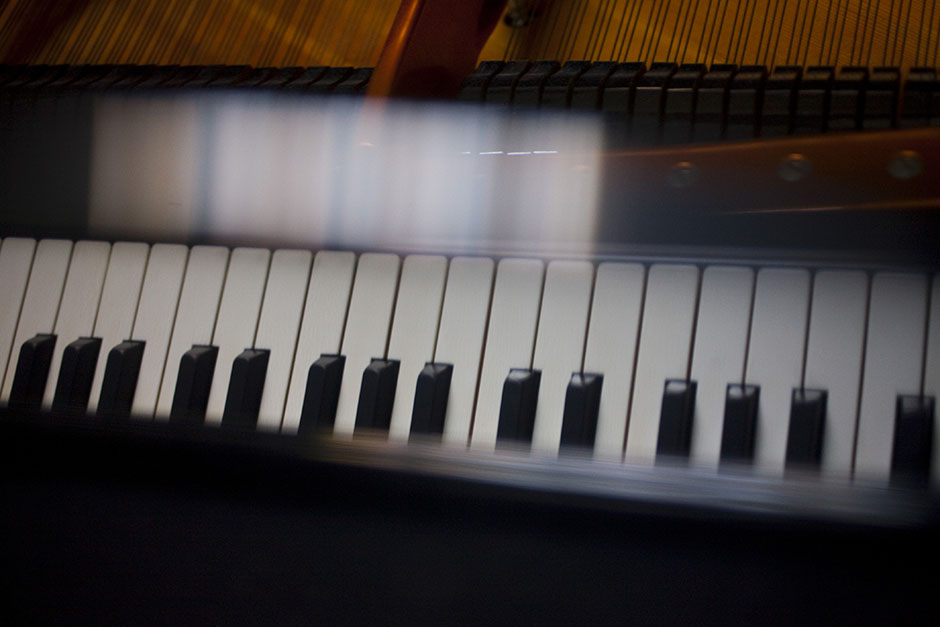 Ebony and ivory. These keys wait untouched, reflected in a glossy encasement that protects the piano inside the Music Building. Stephanie Mitchell/Harvard Staff Photographer