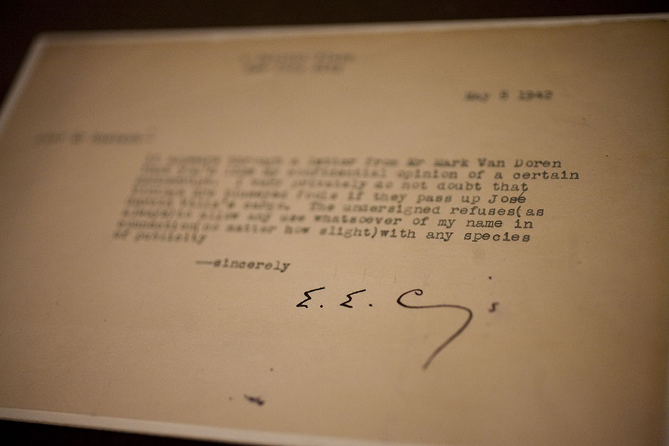 The signature of e.e. cummings punctuates a page in Houghton Library. Stephanie Mitchell/Harvard Staff Photographer