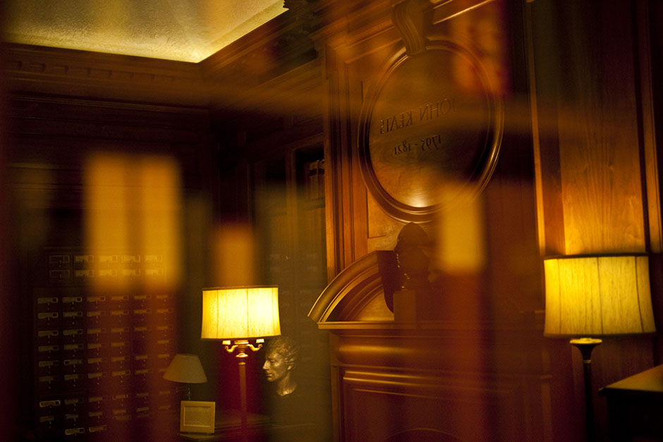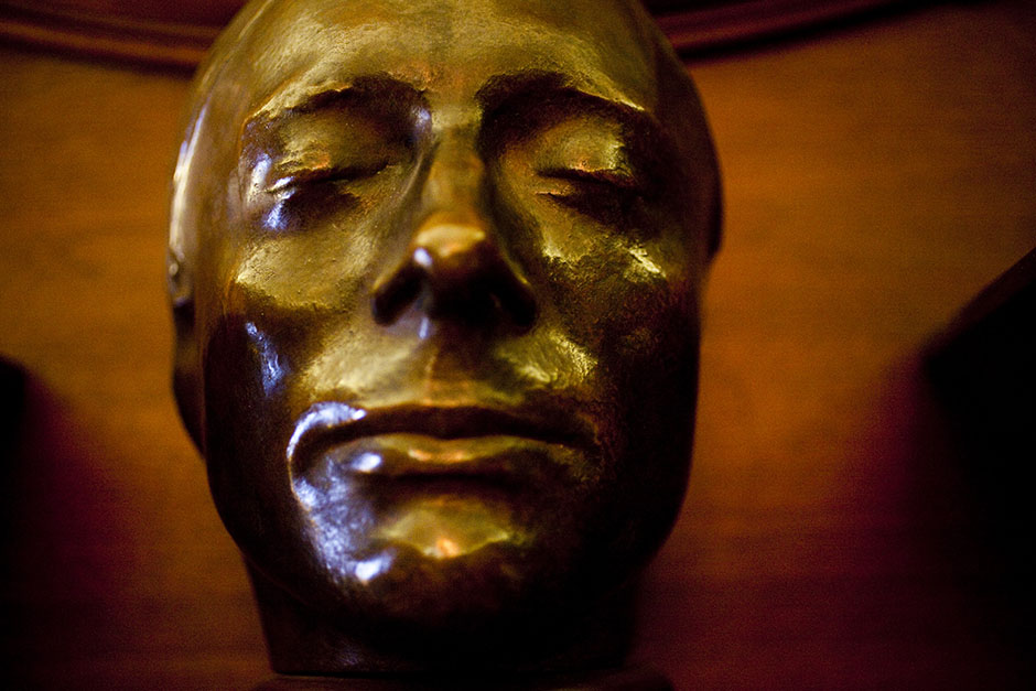 The death mask of John Keats rests above the mantel in the Keats Room of Houghton Library. Stephanie Mitchell/Harvard Staff Photographer