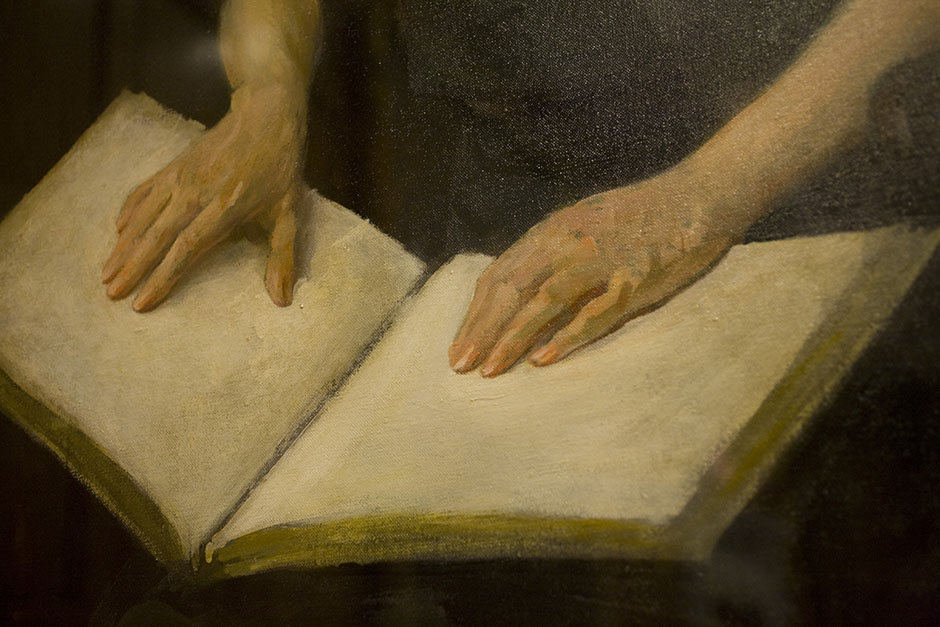 The plaintive hands of Helen Keller hover above these painted pages in the Barker Center’s Thompson Room. Stephanie Mitchell/Harvard Staff Photographer