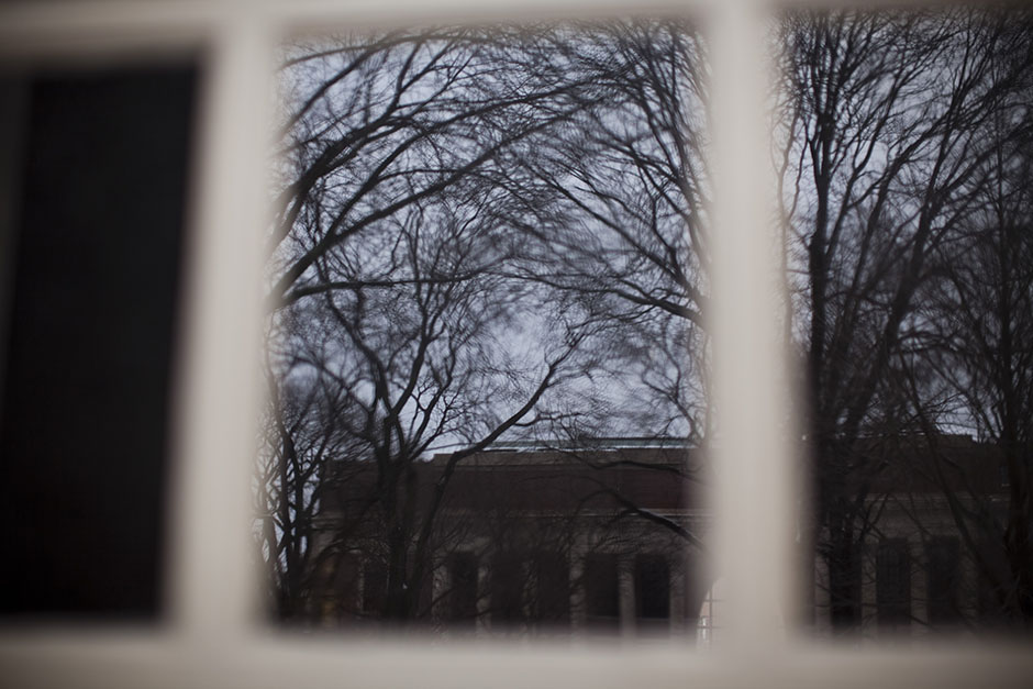 This Memorial Church window reveals a wintry entanglement of trees in Harvard Yard. Stephanie Mitchell/Harvard Staff Photographer