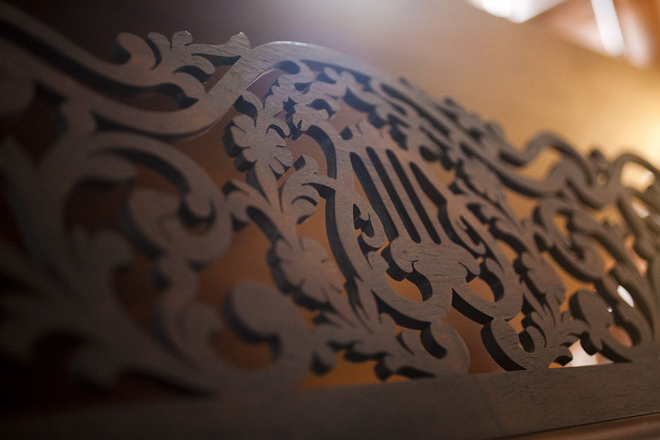 An ornamented music stand awaits a concerto in a River House rehearsal room. Stephanie Mitchell/Harvard Staff Photographer