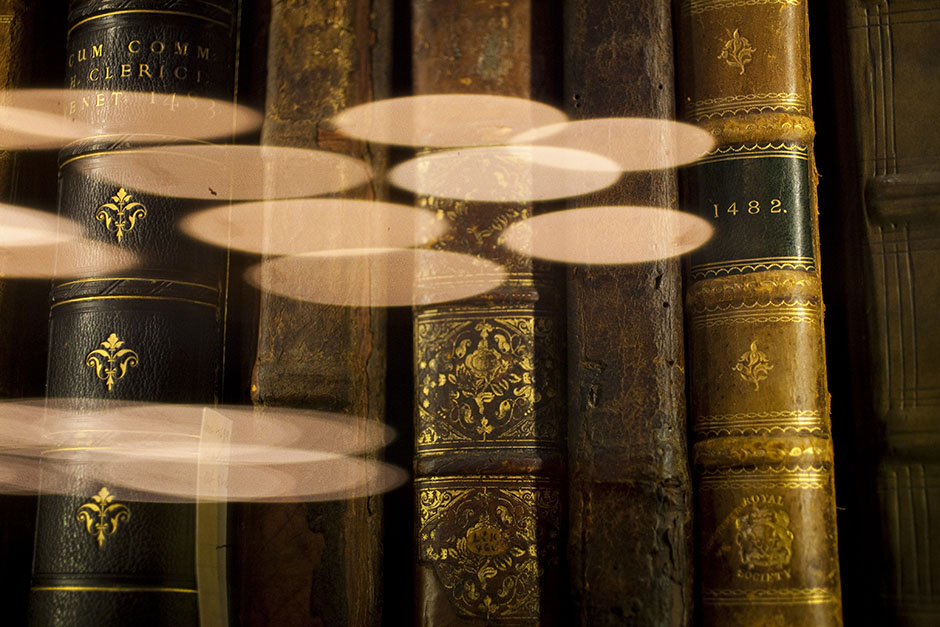Inside Houghton Library, chandeliers reflect off a glass case housing elegantly bound 15th century volumes. Stephanie Mitchell/Harvard Staff Photographer