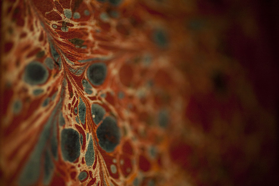A marbleized cover decorates a volume inside the stacks of Widener Library. Stephanie Mitchell/Harvard Staff Photographer